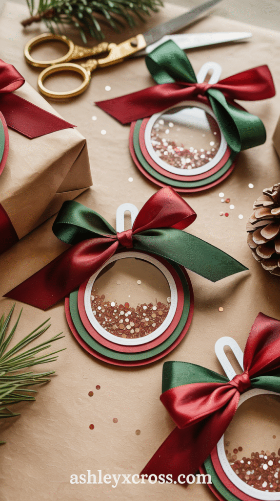Cut a round or snowflake base from cardstock, then add a top layer of clear acetate. Fill the middle with confetti, glitter, or mini cutouts before sealing. Add a bow or hanging ribbon, and your tag becomes both decoration and gift topper.